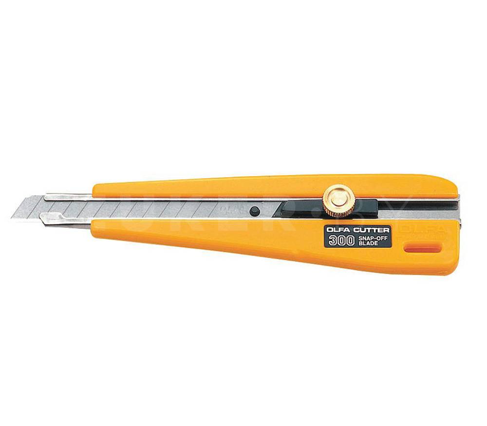 Нож OLFA 9 мм OL-300 оснащен винтовым механизмом фиксации лезвия с трещоточным колесиком. Рукоятка инструмента изготовлена из прочного пластика и оснащен отверстием для подвешивания. Нож применяется для разрезания обоев, бумаги и картона.