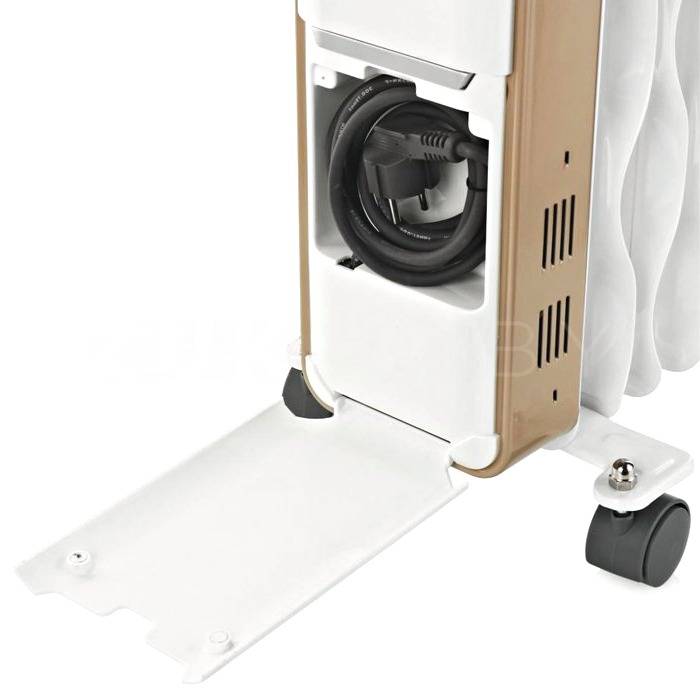 Есть термостат, предусмотрена функция регулировки мощности. Радиатор напольный, для удобства перемещения есть колёсики и ручка, а для хранения шнура предусмотрена ниша.Документы