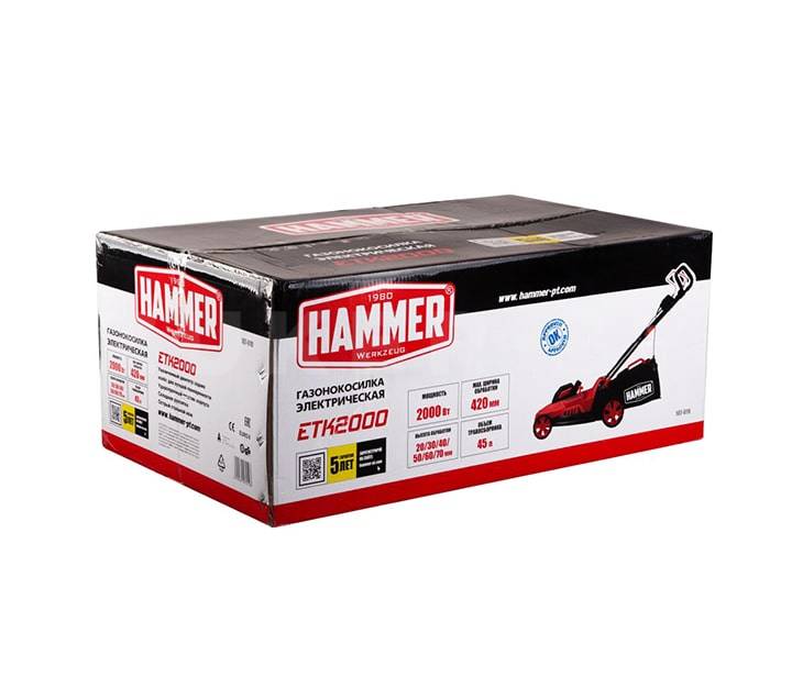 Бренд Hummer Комплектация газонокосилка. травосборник. инструкция Мощность, Вт 2000 Вес, кг 15.5 Тип двигателя щеточный Число оборотов на холостом ходу, об/мин 3500 Уровень шума, Дб 96 Ширина скашивания, см 42 Высота стрижки, мм 20-70 Объем травосборника, л 45 Тип рукоятки складная -