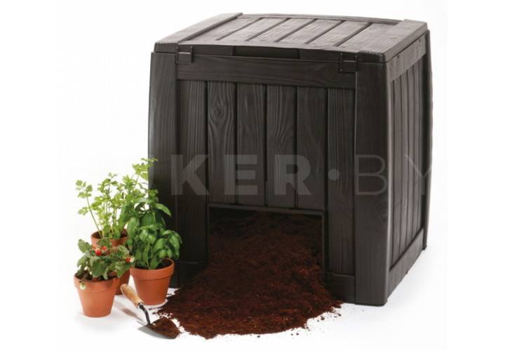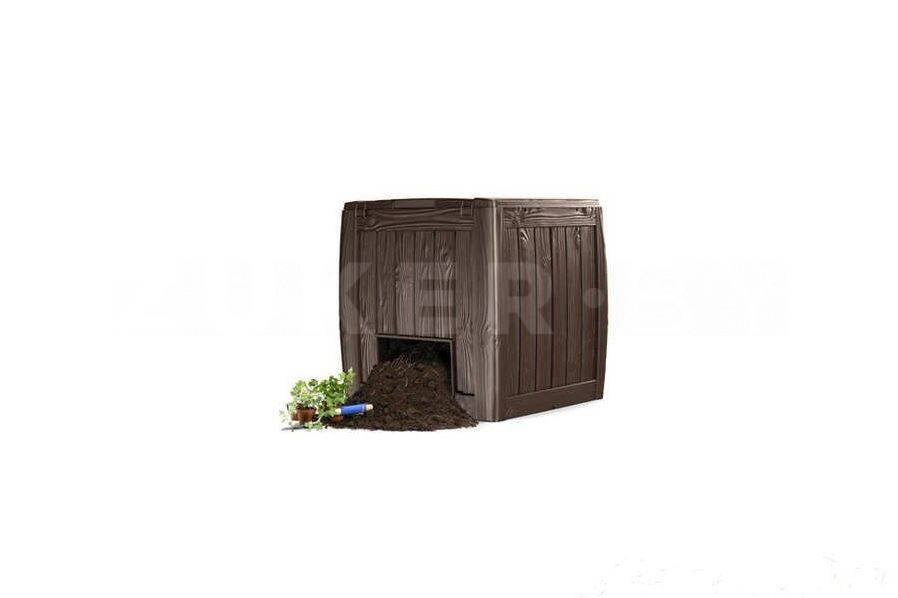 Небольшой компостер из пластика стилизован под дерево и может быть установлен в любом удобном для вас месте на дачном участке и эргономично вписаться в окружающую среду.
