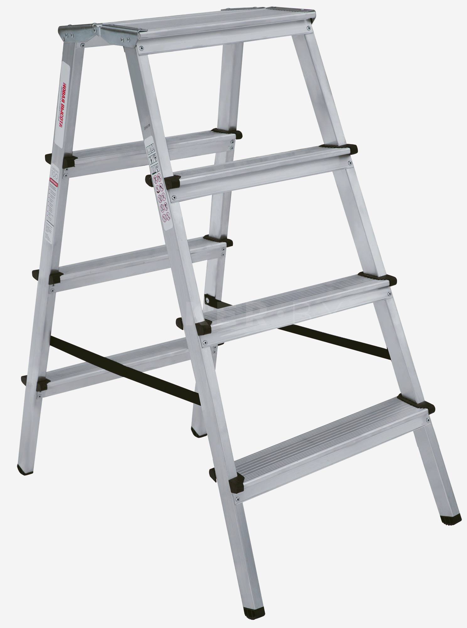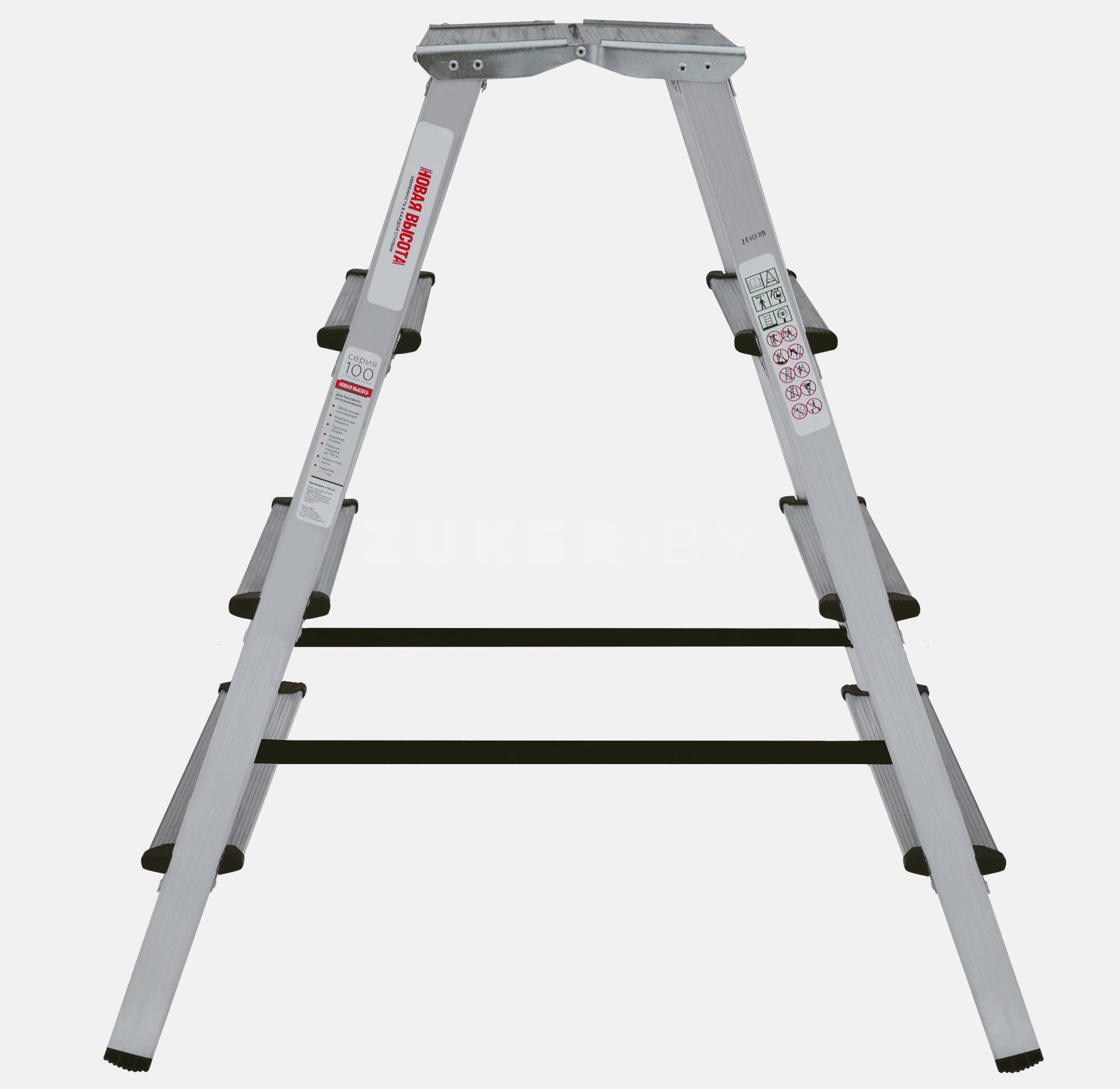 - Ориентация ступеней на обе стороны позволяет работать, не переставляя стремянку и тем самым экономя время